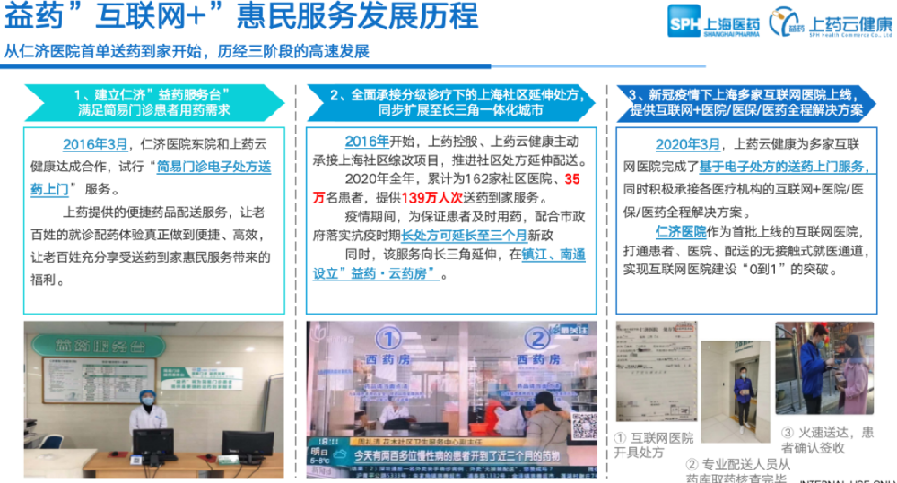 2020年3月,上藥云健康為多家互聯(lián)網(wǎng)醫(yī)院完成了基于電子處方的送藥上門服務(wù),同時積極承接各醫(yī)療機構(gòu)的互聯(lián)網(wǎng)+醫(yī)院/醫(yī)保/醫(yī)藥全程解決方案。仁濟醫(yī)院作為首批上線的互聯(lián)網(wǎng)醫(yī)院,充分打通了患者、醫(yī)院、配送服務(wù)的無接觸式就醫(yī)通道,實現(xiàn)了互聯(lián)網(wǎng)醫(yī)院建設(shè)“0到1”的突破。